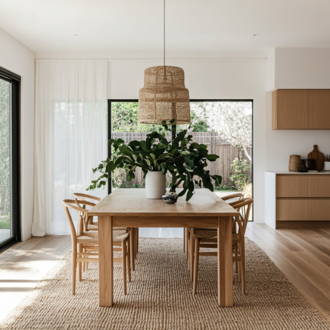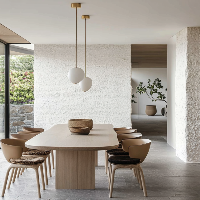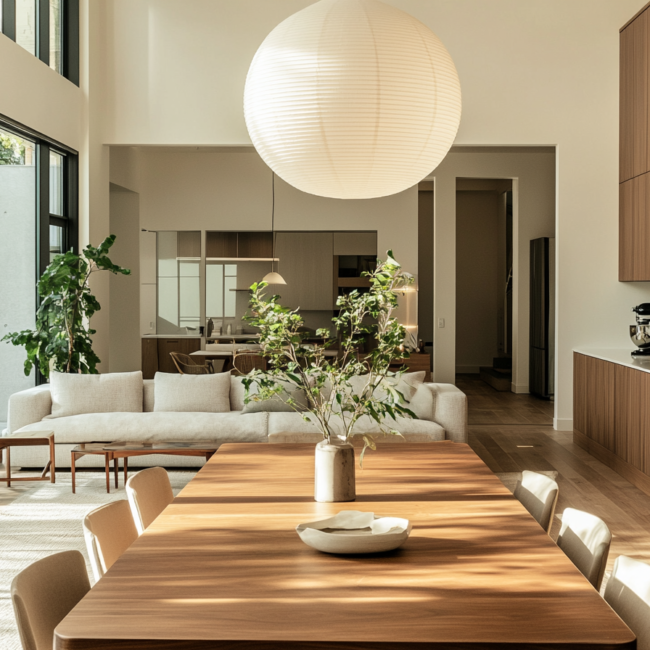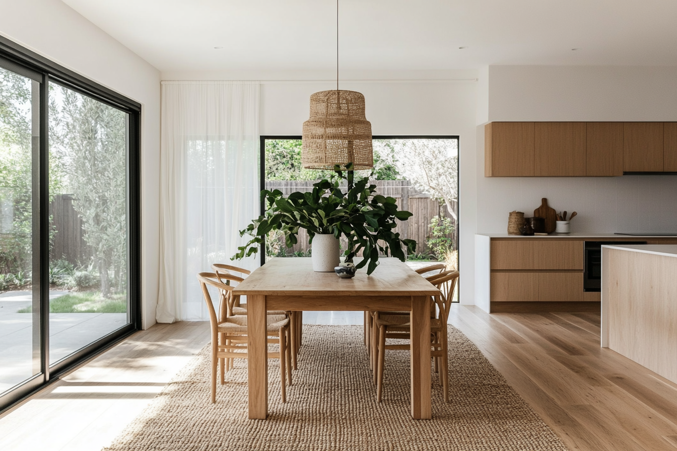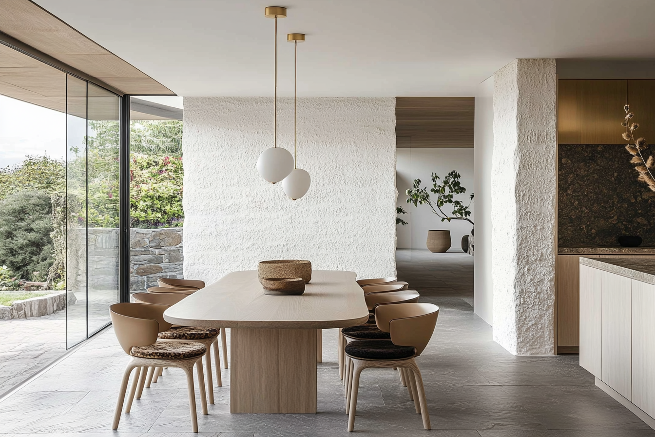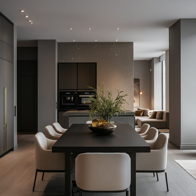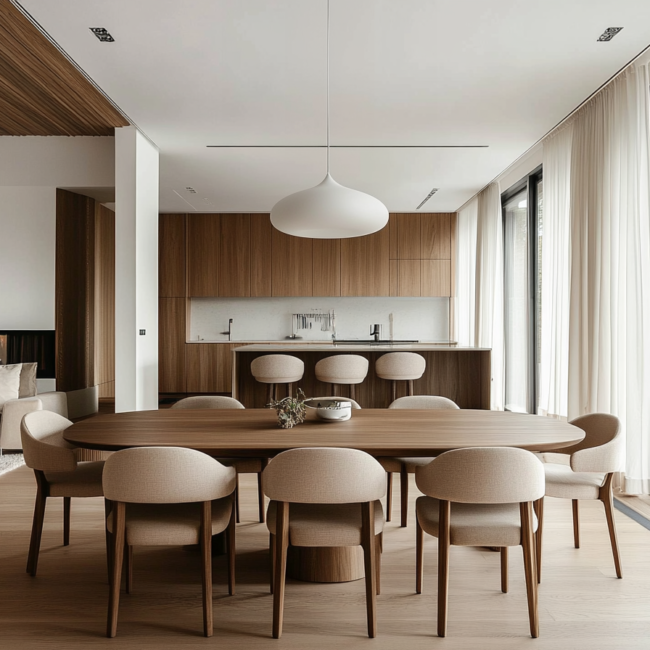 Materiality plays a central role in shaping mood and tone. Warm timber tables anchor the space with an organic touch, while stone or concrete floors extend from kitchen to lounge, enhancing the feeling of visual continuity. The dining chairs — often sculptural, sometimes minimalist — define personality without disturbing the calm. Even lighting becomes storytelling: a pendant that hangs low over the table signals focus and intimacy, while ambient light from the living room adds softness to evenings shared with friends or family.