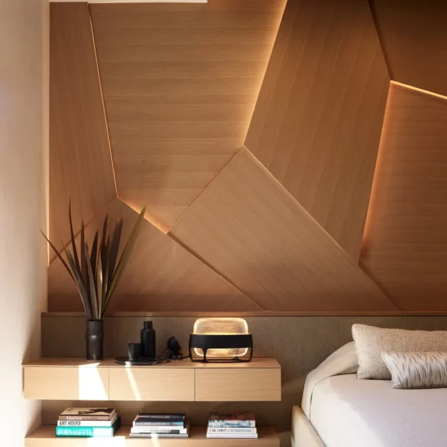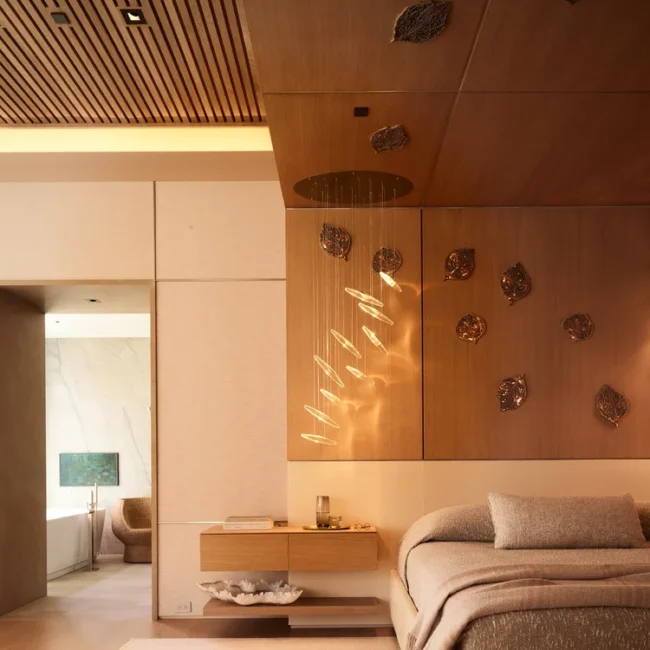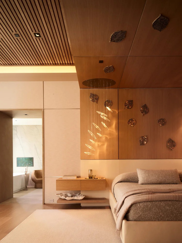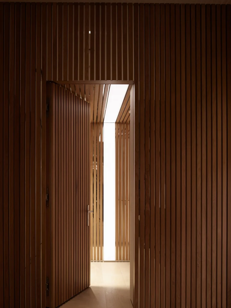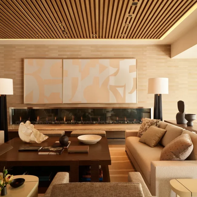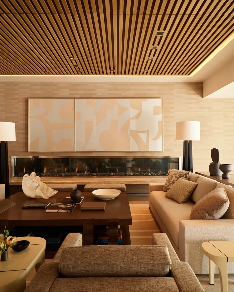 Above, the use of oak extends into the ceilings, where slatted panels stretch across living spaces and bedrooms. Here, the material takes on a more architectural role. The slats conceal lighting, sprinklers, and sound systems, transforming what would typically be visible into something resolved and seamless. Light filters through in controlled ways, creating depth and rhythm overhead, while maintaining the illusion of simplicity.