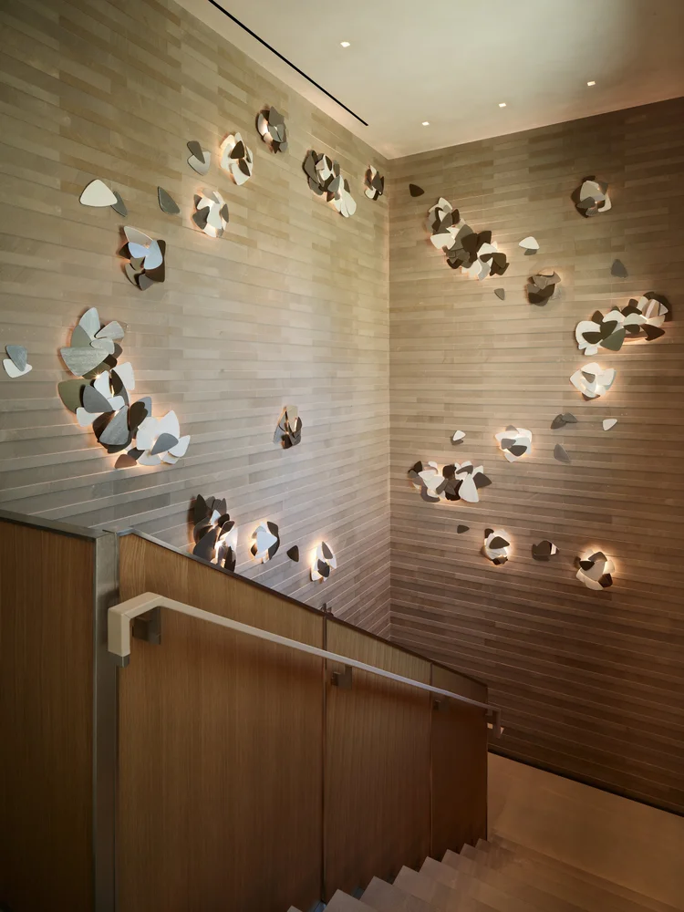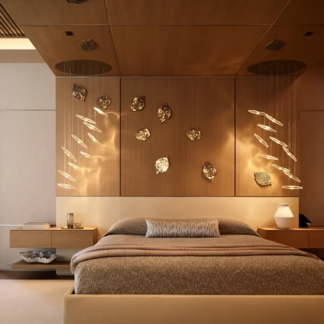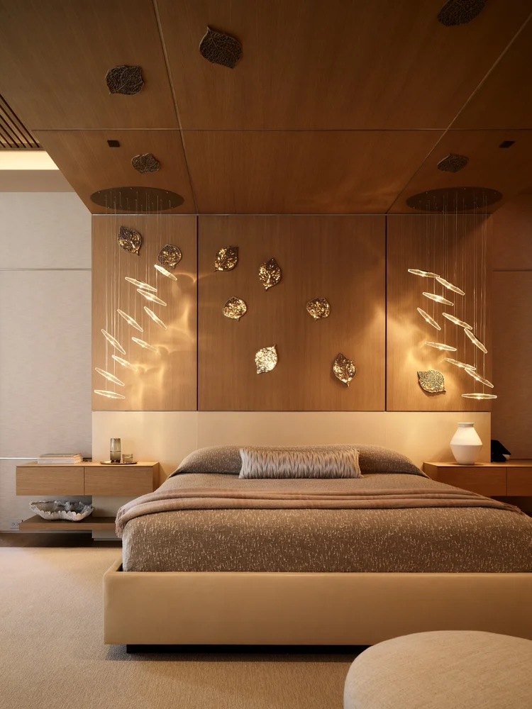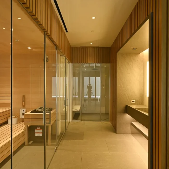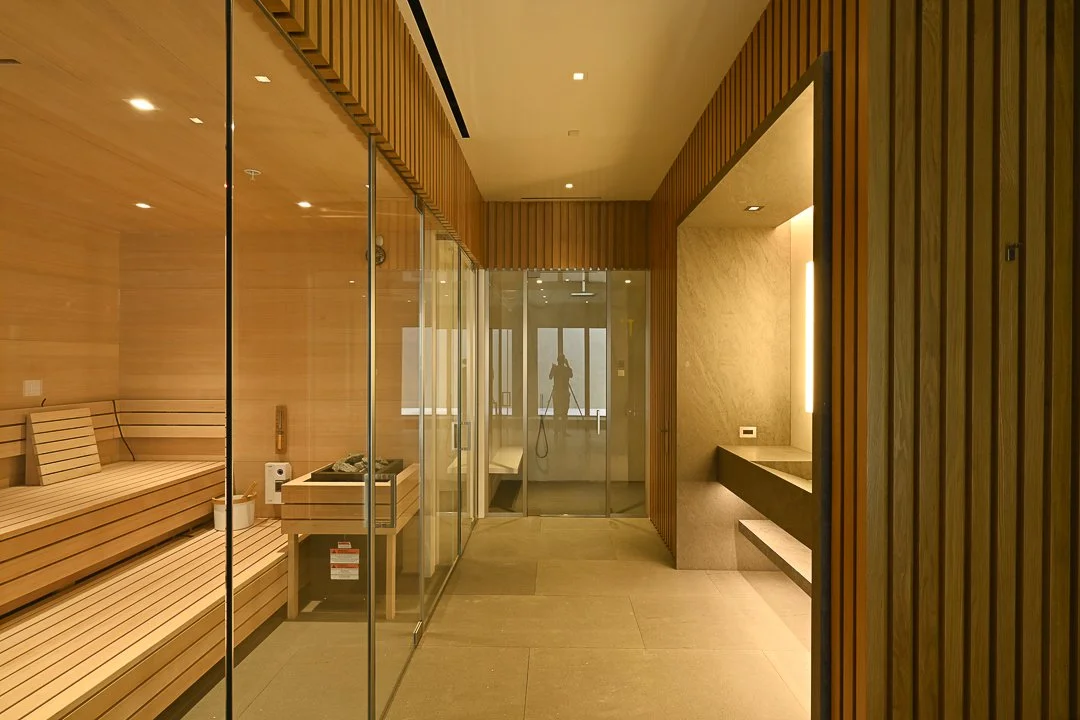 Above, the use of oak extends into the ceilings, where slatted panels stretch across living spaces and bedrooms. Here, the material takes on a more architectural role. The slats conceal lighting, sprinklers, and sound systems, transforming what would typically be visible into something resolved and seamless. Light filters through in controlled ways, creating depth and rhythm overhead, while maintaining the illusion of simplicity.